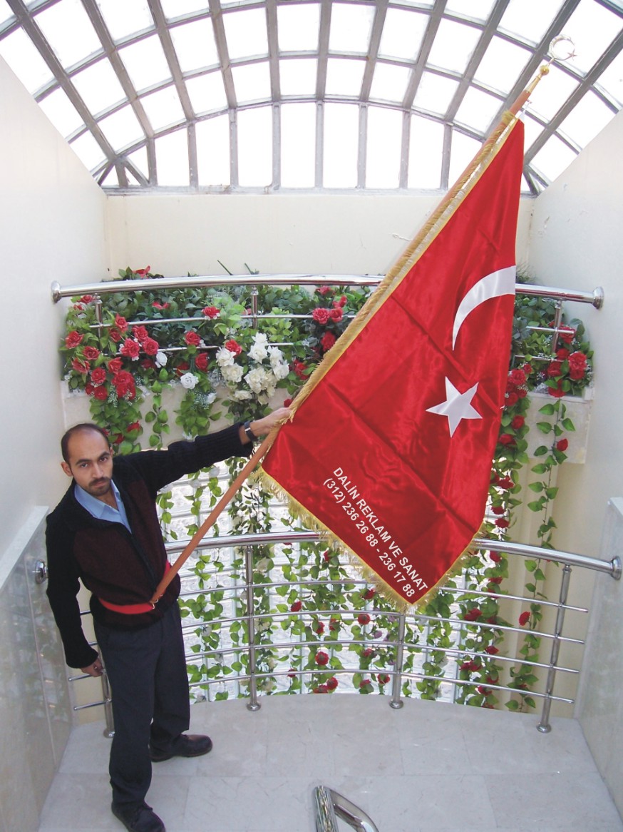 Örnekte görülen Bayrak 1. Sınıf ipek saten atlas kumaştan çift kat olup sarı yaldız simlidir.