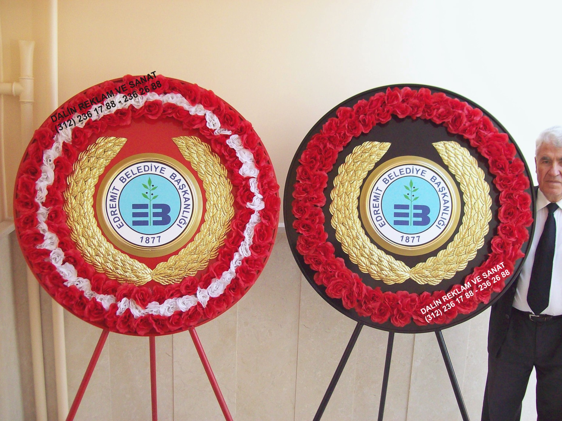 Üç sıra yapma çiçekli 100 cm çapında metal kutlama ve cenaze çelengi bir arada